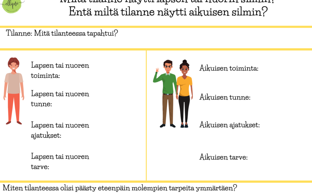 Tätä materiaalia voi työstää aikuisten kesken ja pohtia, mitä tilanteessa tapahtui tavoitelleen oma ja lapsen näkökulmaa. Yhtä hyvin tilannetta voi tutkia jälkikäteen myös yhdessä lapsen tai nuoren kanssa.