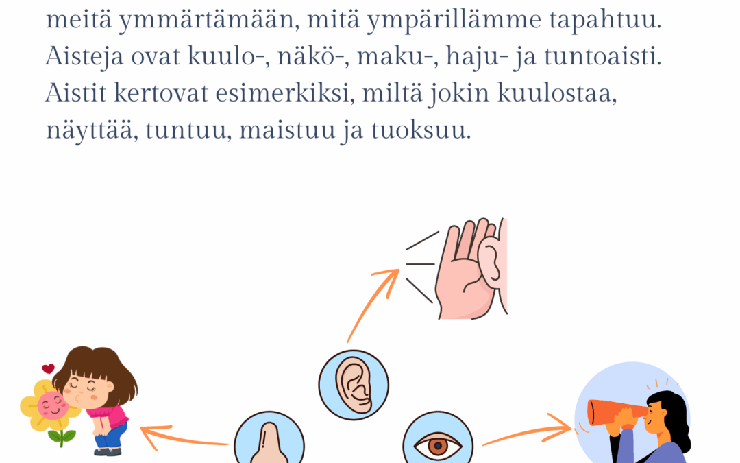 Ihmisillä on tavallisesti viisi aistia, jotka auttavat meitä ymmärtämään, mitä ympärillämme tapahtuu. Aisteja ovat kuulo-, näkö-, maku-, haju- ja tuntoaisti. Aistit kertovat esimerkiksi, miltä jokin kuulostaa, näyttää, tuntuu, maistuu ja tuoksuu.