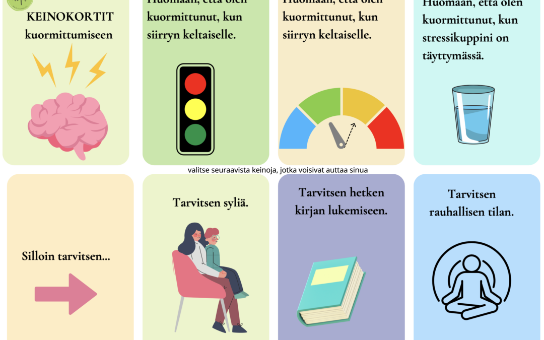 🔍Korttien alussa on kolme erilaista korttia, jotka kuvaavat, miten voi havahtua omaan kuormittumiseen. Lapsen tai nuoren kanssa voi valita kortin, joka kuvaa tapaa, jolla hänen kanssaan on käsitelty kuormittumisen tunnetta.