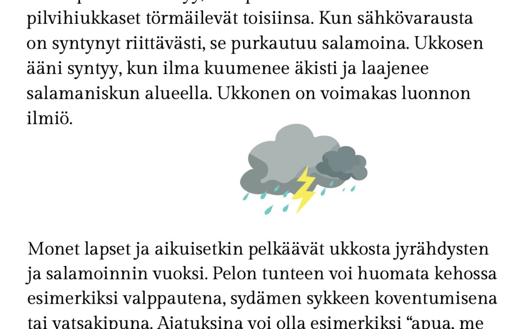 Tein sitä tarkoitusta varten psykoedukaatiomateriaalin lapselle. Psykoedukaatiomateriaaliin on koottu lapsentasoisesti tietoa pelon syntymisestä aivoissa, taistele-pakene-reaktiosta ja sen kehollisista tuntemuksista. Tietopaketti kertoo lapselle pelkoa ylläpitävien ajatusten merkityksestä sekä mallintaa altistamiseen pohjaavaa ukkospelon hoitoa lapselle.